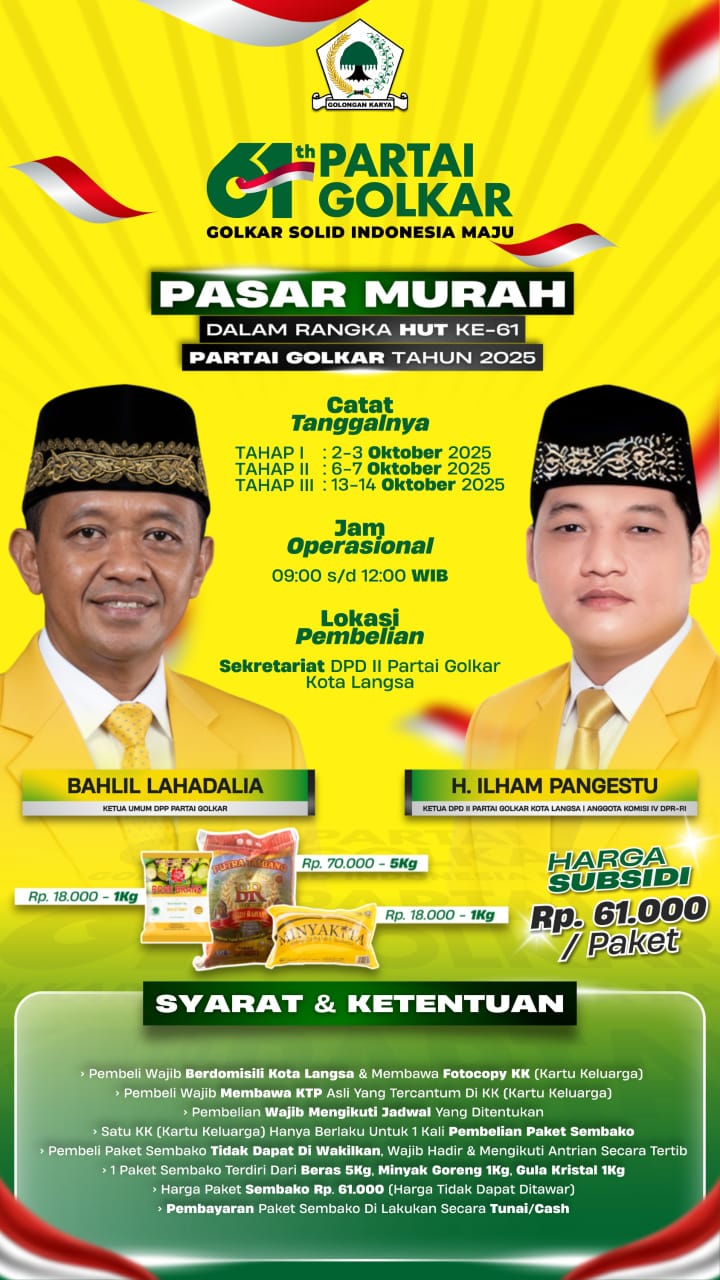 Ketua Golkar Kota Langsa H Ilham Pangestu kepada wartawan, Selasa malam, 30 September 2025 mengatakan kegiatan pasar murah ini akan dilaksanakan selama 3 tahap.