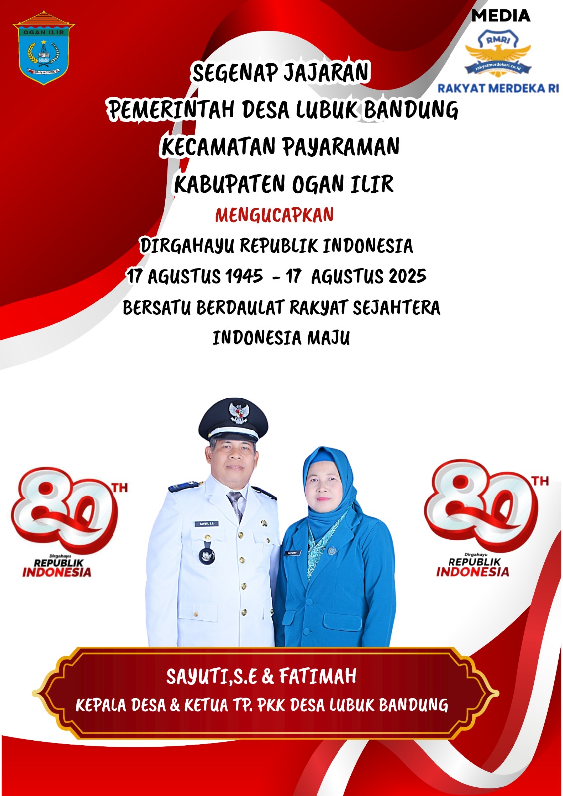 Dalam rangka HUT RI yang ke 80 Tahun 2025 Pemerintah desa Lubuk Bandung Kecamatan Payaraman kabupaten ogan ilir mengucapkan Dirgahayu Republik Indonesia yang ke 80 Tahun