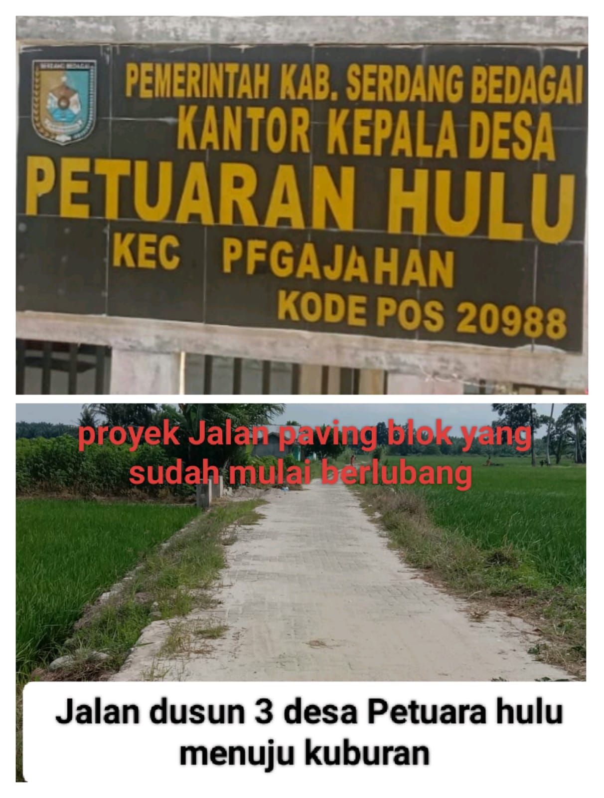 Lanjutnya, namun hal tersebut sepertinya tidak berlaku di desa kami ini, banyak bangunan – bangunan desa yang berdiri di wilayah desa tetangga, seperti bangunan irigasi berada di desa Lestari dadi, Pegajahan dan Petuara hilir. Sementara pembangunan yang di wilayah desa sendiri belum ada satu tahun keadaannya sudah Compang camping jalan paving blok dan pembangunan jembatan di dusun 2 tidak tidak transparan karna tidak adanya papan proyek.