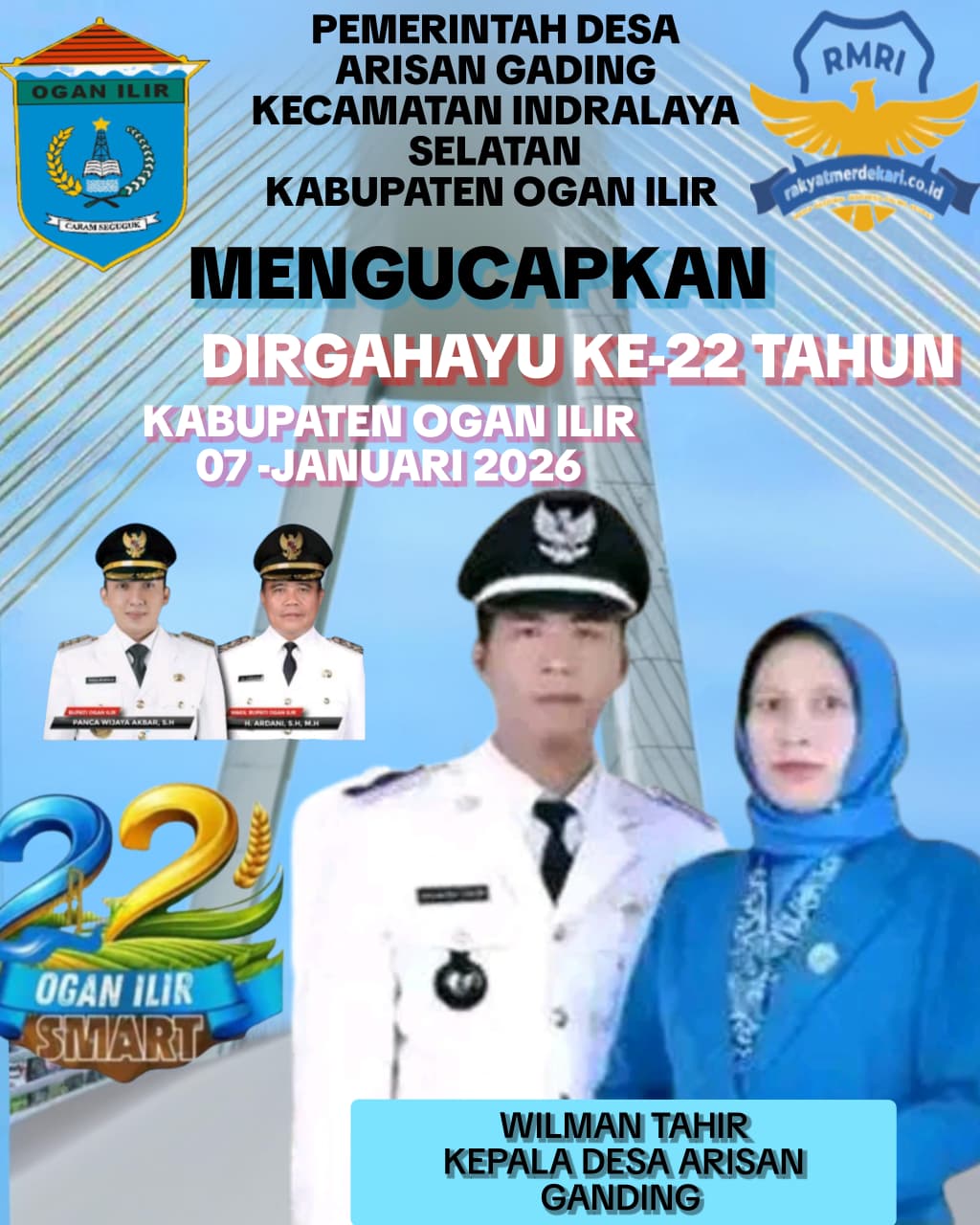 Kepala desa Arisan Gading Wilman Tahir Beserta, Jajaran Perangkat desa Mengucapkan Dirgahayu Ke-22 Tahun Kabupaten Ogan Ilir jatuh pada hari rabu Tanggal 07 Januari 2026