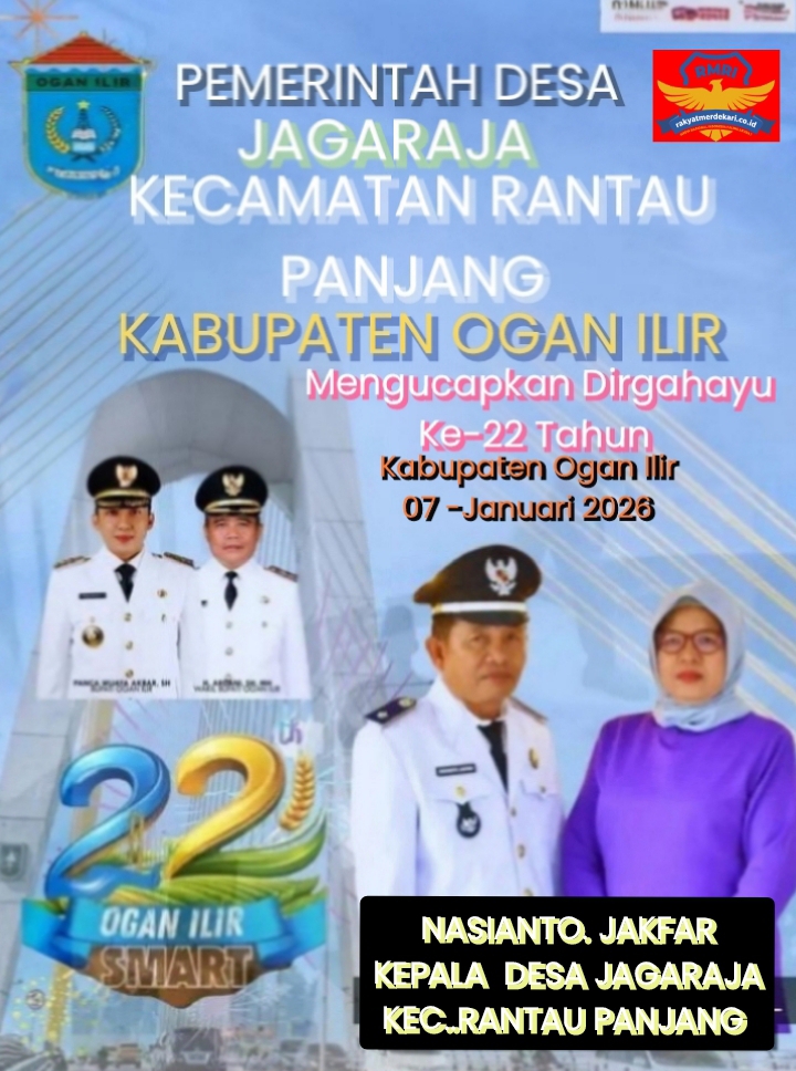 Kepala desa, Jagaraja beserta jajaran Perangkat desa Mengucapkan Dirgahayu Ke-22 tahun Kabupaten Ogan Ilir jatuh pada hari rabu tanggal 07 Januari.2026