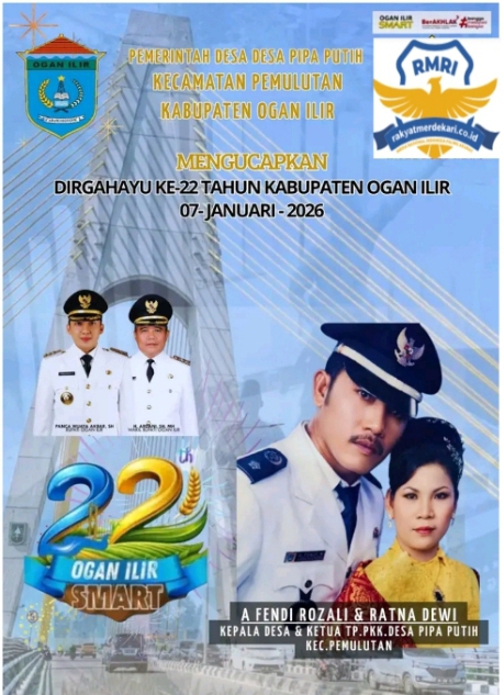 Dalam rangka memperingati HUT, Ogan Ilir Ke -22 Tahun Pada hari Rabu ( 07- Januari- 2026 ) Kepala, desa Pipa putih A .Fendi Rozali beserta jajaran Perangkat desa,” Pipa putih Kecamatan Pemulutan Mengucapkan selamat HUT Ogan Ilir Ke -22 Tahun