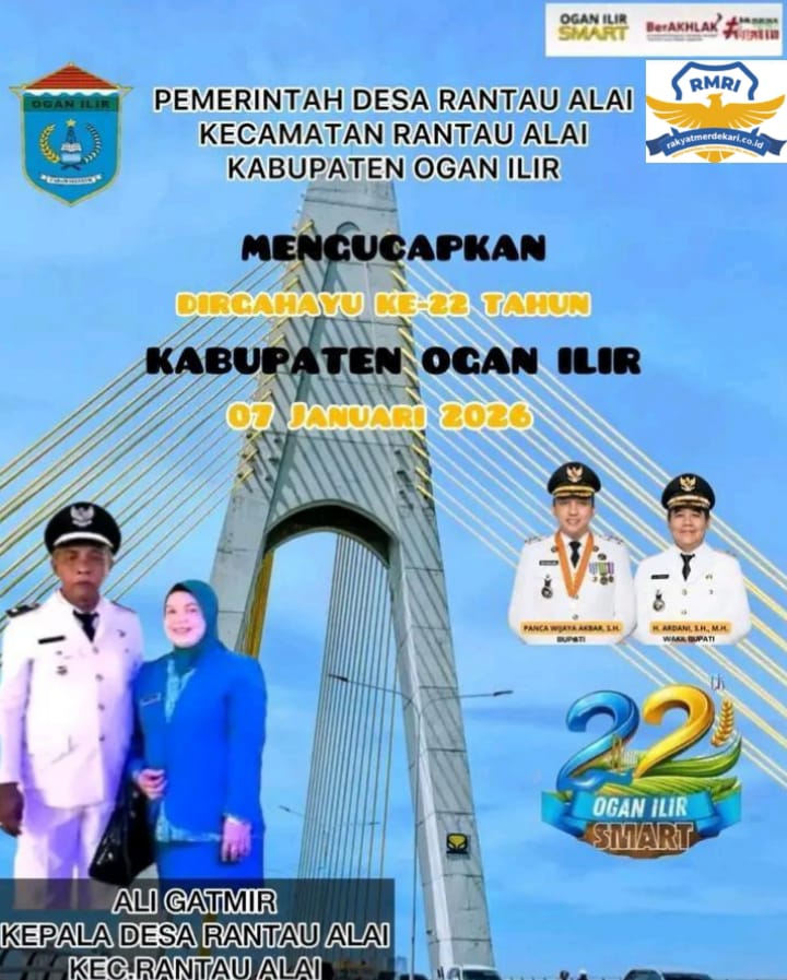 Kepala desa beserta jajaran Perangkat desa Rantau alai mengucapkan selamat Hari Ulang Tahun Ke-22 Tahun Kabupaten Ogan Ilir jatuh pada hari Rabu 07-Januari 2026