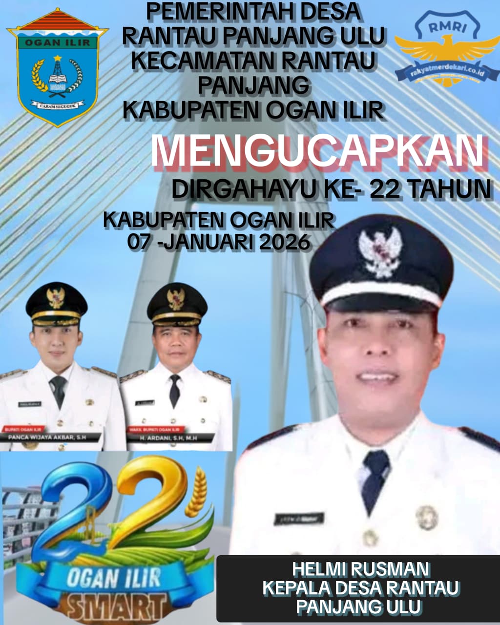 Kepala Desa Rantau Panjang Ulu Helmi Rusman Beserta Jajaran Perangkat Desa Mengucapkan,”Selamat Hari Ulang Tahun Kabupaten Ogan Ilir Ke-22 Tahun