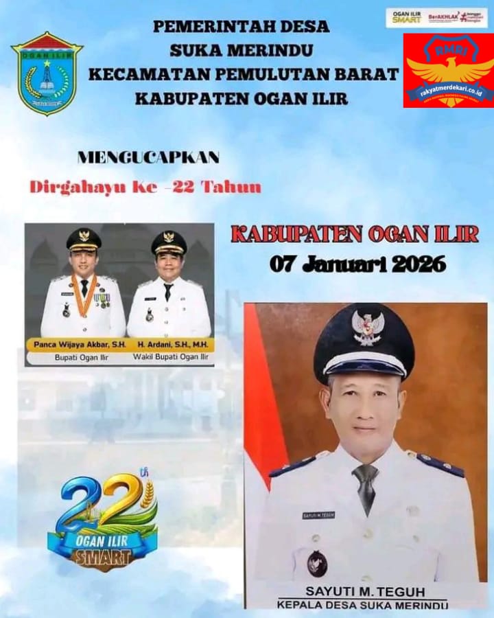 Kepala desa Suka merindu, Kecamatan Pemulutan barat turut mengucapkan selamat Hari Jadi Kabupaten Ogan Ilir yang ke -22 tahun jatuh pada tanggal 07 Januari.2026