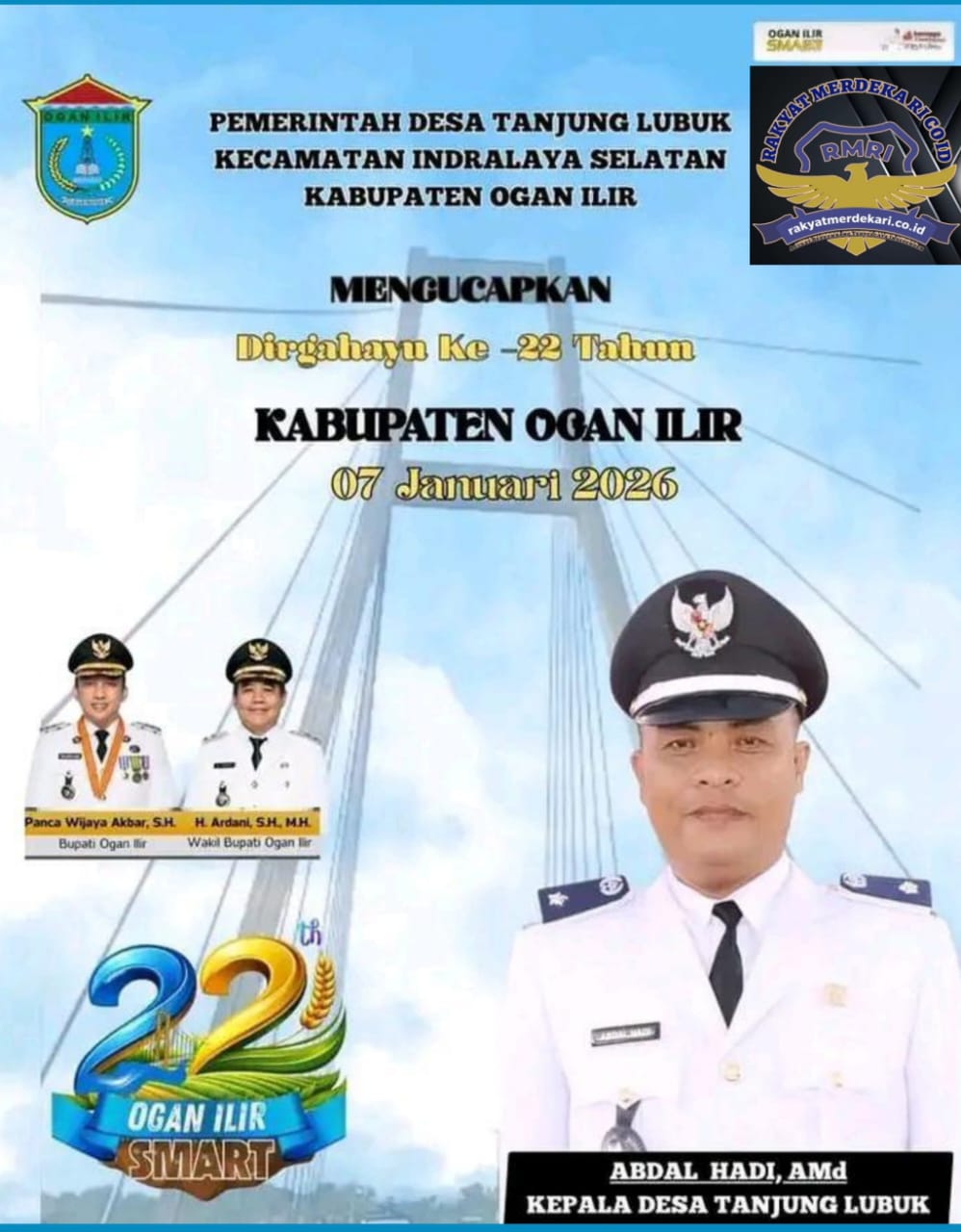 Kepala desa Tanjung lubuk dengan penuh rasa bangga dan suka cita mengucapkan selamat hari jadi Kabupaten Ogan Ilir yang ke -22 Tahun jatuh pada hari Rabu tanggal 07 Januari 2026, kepada seluruh masyarakat Tanjung lubuk peringatan hari jadi ini menjadi momentum penting untuk merefleksikan perjalanan panjang Kabupaten Ogan Ilir dalam membangun daerah serta meningkatkan kesejahteraan masyarakat