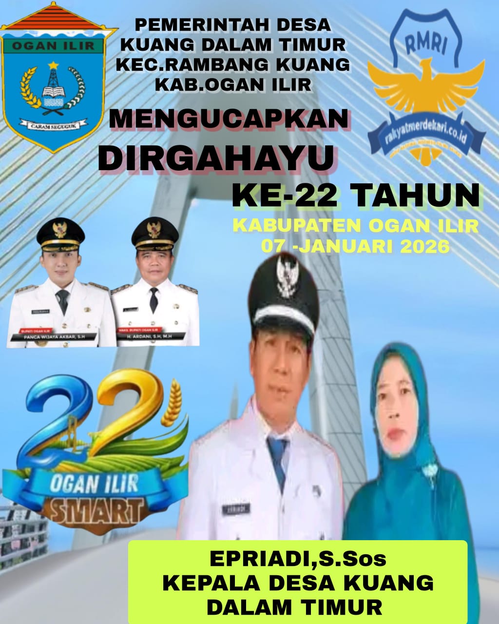 Pemerintah Desa Kuang Dalam Timur EPRIADI,S.Sos Beserta Staf dan Jajaran Mengucapkan selamat Ulang Tahun Kabupaten Ogan Ilir Ke-22 Tahun 2026