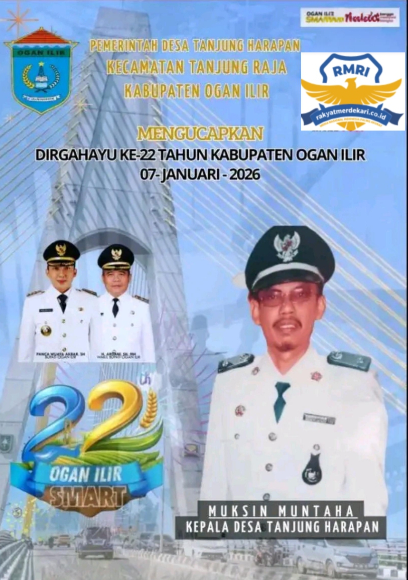 Pemerintah Desa Tanjung harapan Kecamatan Tanjung raja Mengucapkan selamat Hari Ulang Tahun Kabupaten Ogan Ilir yang ke -22 tahun jatuh pada hari Rabu tanggal 07 Januari -2026 dalam momentum ini Kepala desa Tanjung harapan beserta jajaran Perangkat desa mengajak seluruh lapisan masyarakat untuk terus menjaga semangat kebersamaan dan membangun daerah secara berkelanjutan bersatu untuk ogan Ilir,” Smart