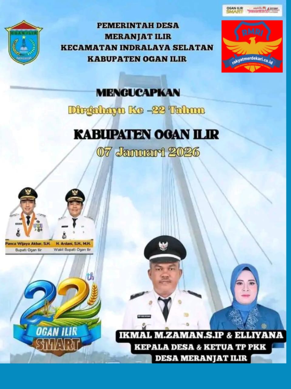 Jajaran Pemerintah desa Meranjat Ilir,”Kecamatan Indralaya selatan Mengucapkan selamat Hari Ulang Tahun Kabupaten Ogan Ilir yang ke -22 tahun jatuh pada hari Rabu,” 07 -Januari -2026