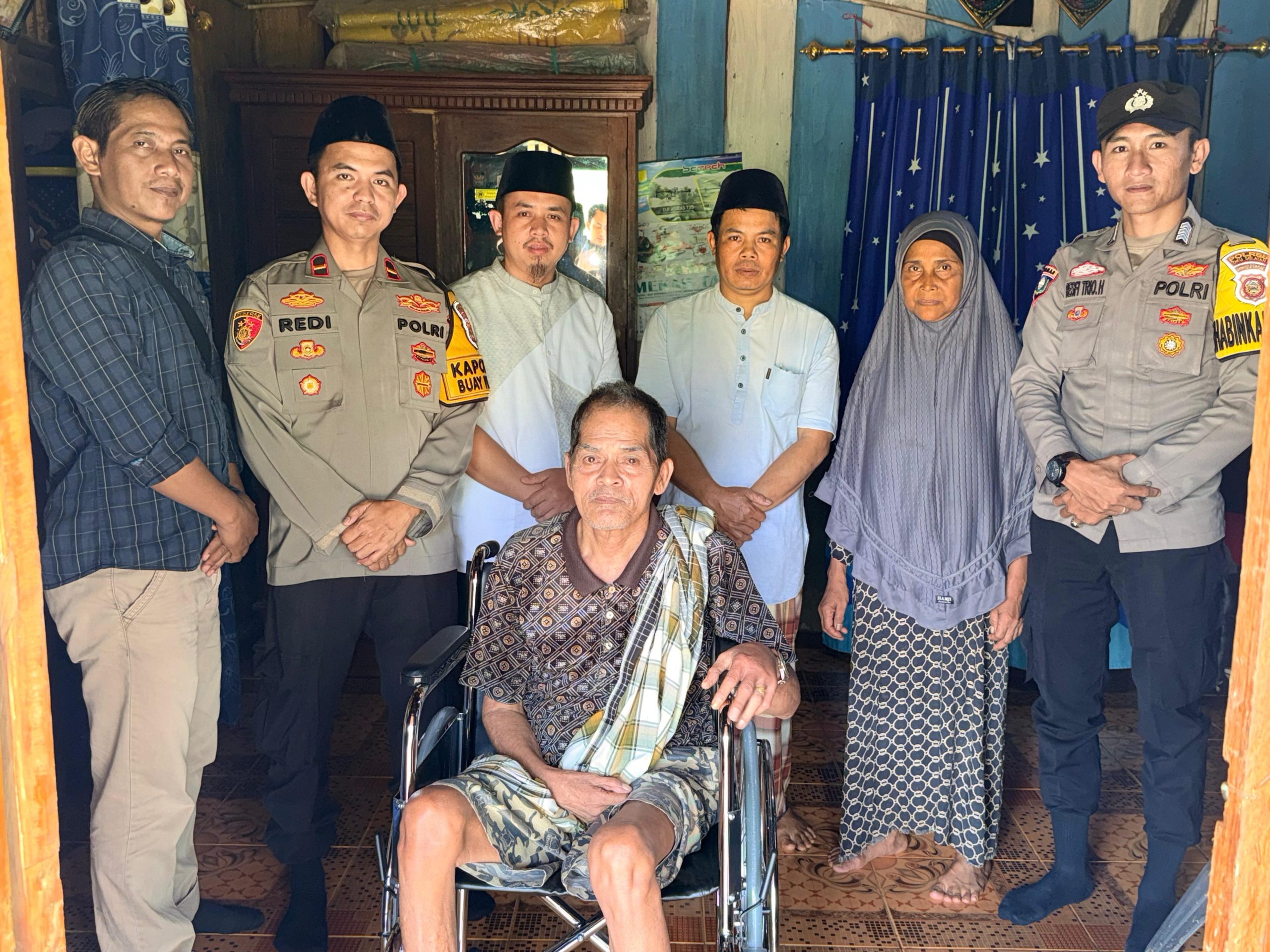 Kapolsek Buay Pemaca IPDA Redy Sahputra, S.H bersama Bhabinkamtibmas menyerahkan bantuan kursi roda kepada seorang warga penderita stroke di Desa Tanjung Jaya, Kecamatan Buay Pemaca, Kabupaten Ogan Komering Ulu (OKU) Selatan, Jumat (13/3/2026).